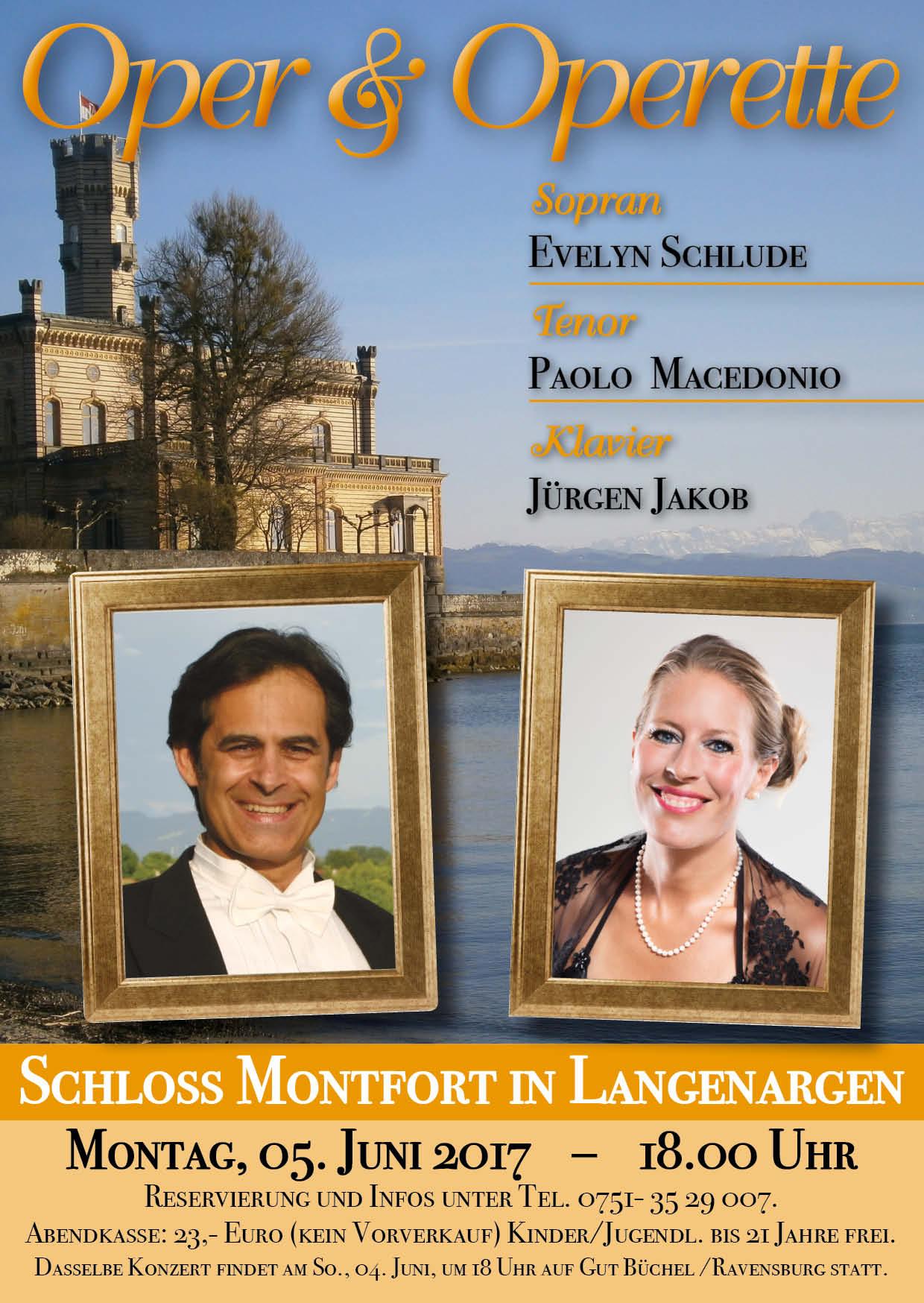 Pfingstmontag, 5. Juni 2017, 18.00 Uhr - Schloss Montfort, Langenargen Highlights aus Oper und Operette Evelyn Schlude, Sopran Paolo Macedonio, Tenor Jürgen Jakob, Klavier Eintritt 23,00 Euro. Einlass und Abendkasse jeweils ab 17:00 Uhr. Informationen und Kartenreservierung: Tel. 0751/3529007.