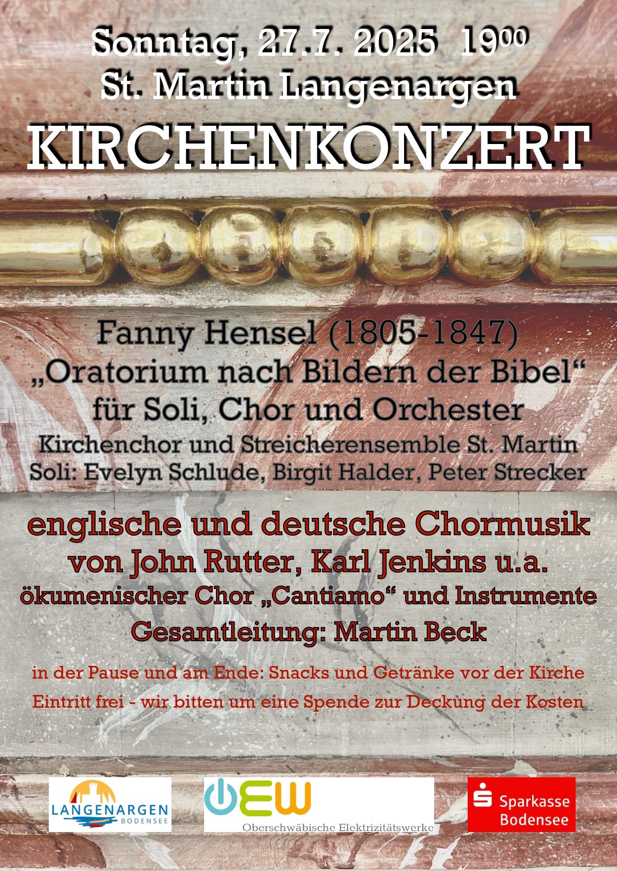 Kath. Pfarrkirche St. Martin, Langenargen Kirchenkonzert Fanny Hensel: Oratorium nach Bildern der Bibel für Soli, Chor und Orchester Evelyn Schlude, Sopran Birgit Halder, Alt Peter Strecker, Bass Kirchenchor und Streicherensemble St. Martin Langenargen Leitung: Martin Beck - außerdem englische und deutsche Chormusik mit dem Chor "Cantiamo" und Instrumentalisten - Eintritt frei. Um Spenden wird gebeten. ![]() |